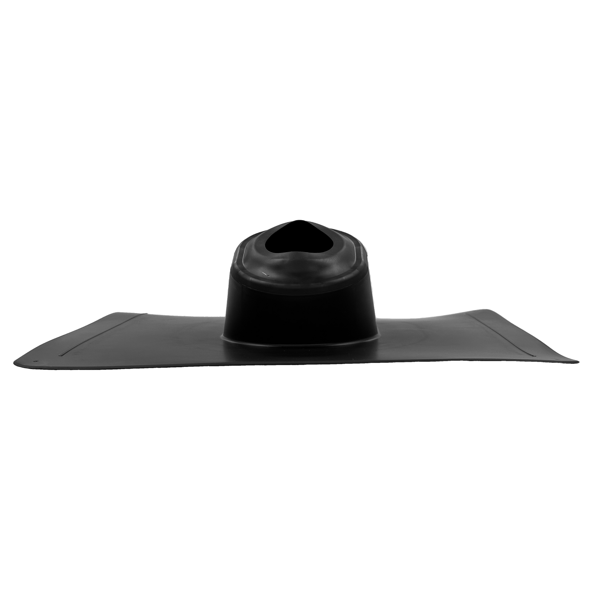 This roof flashing has a non-fading, non-cracking, rigid 16 x 16 inch black thermoplastic base. The material can accommodate pipes made from a variety of materials such as plastic, copper, and cast iron. Its self-sealing collar works the best for 3 inch pipes and it slides over the top which simultaneously creates a water tight seal that eliminates caulking. The flashing is tilted at a 45 degree angle that is designed to sit well on the slope of the roof and blends nicely with the house.